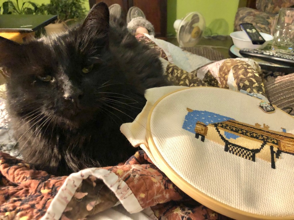 The catio was closed off to them for construction (more on that soon) for a good chunk of the weekend, so he was being extra needy every time I sat down. I’m more than happy to have him chill in my lap while I stitch, but he likes to grab at the needle and thread as it comes through on the back side. It makes for some slow stitching.