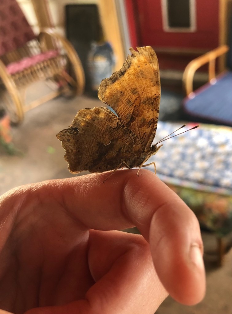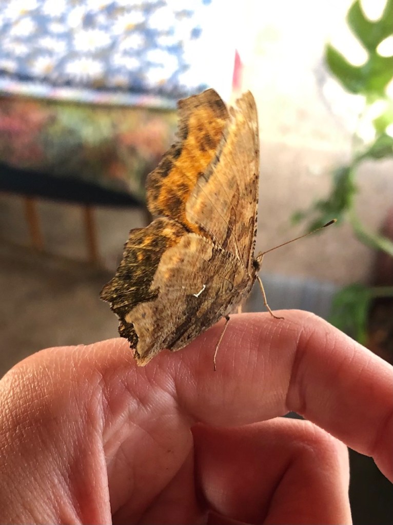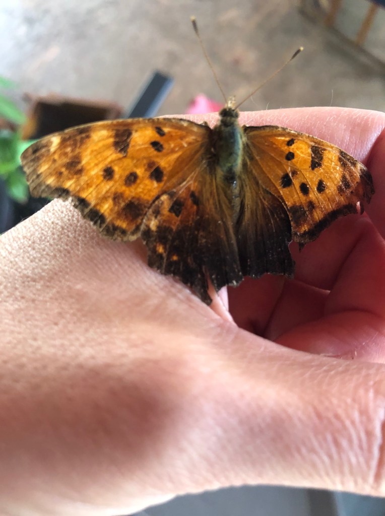 This is an Eastern Comma butterfly. He didn’t fly away until I walked out into the catio yard.