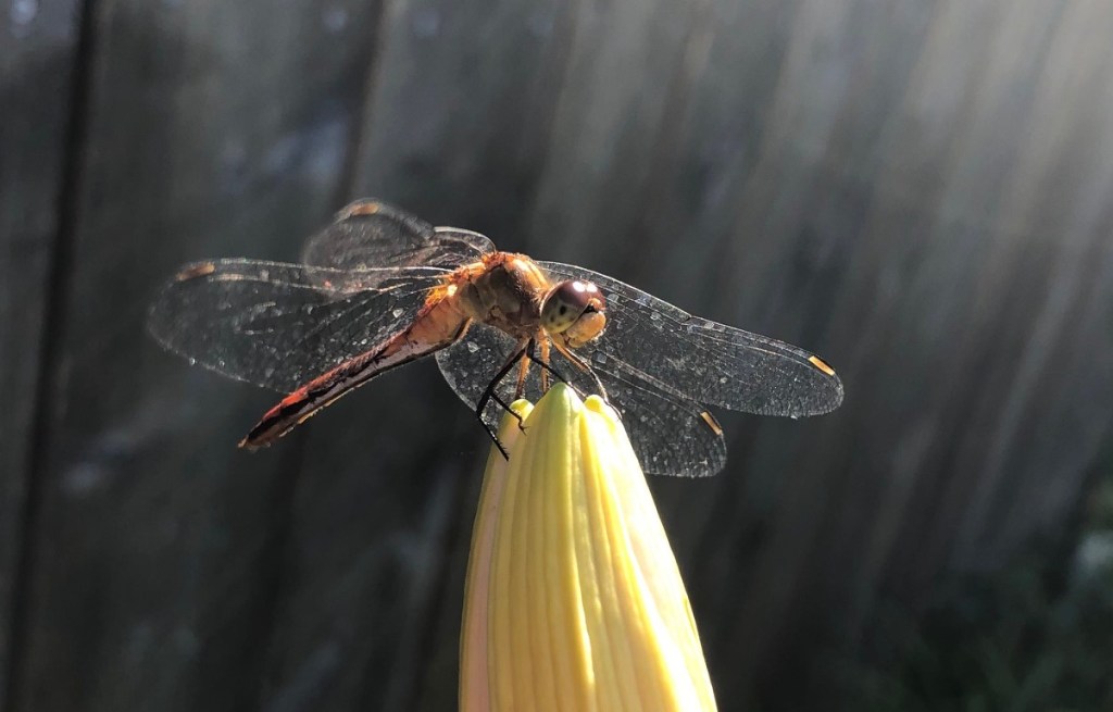 This big beauty practically posed for photos atop this daylily bud. I’m note sure if it’s a 12-spotted skimmer dragonfly, or and orange meadowhawk.. Whatever it is, I think it’s beautiful!