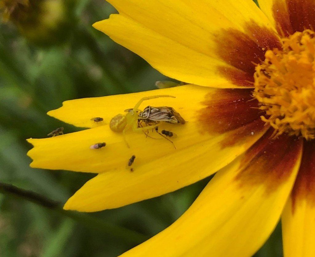 Crab spiders are abundant in the garden .It’s not uncommon to find one hiding in the petals of a coneflower or tickseed (as seen here). What is unusual is to catch it eating a meal of stinkbug. Even more unsual is to see it eating a meal surrounded by a bunch of baby fly minions…