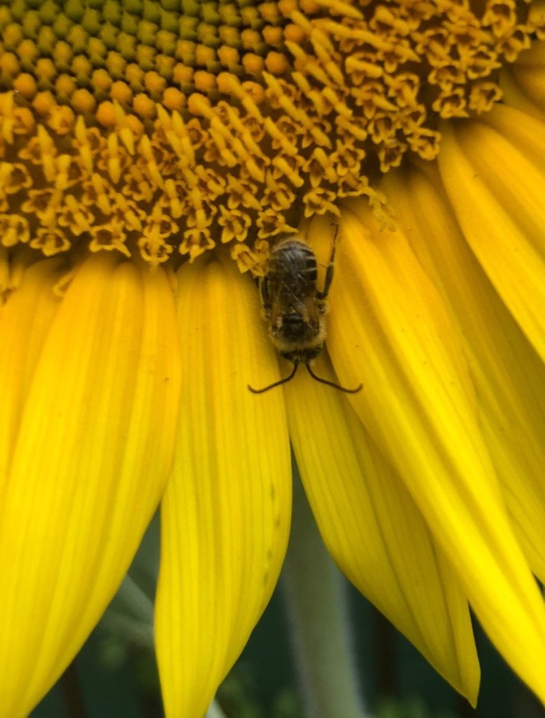 I’ve never seen it before, but it happens pretty regularly. Now I check the sunflowers every evening, and there’s almost always one bee who’s settled in for the night. But one evening…
