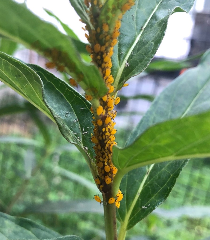 These guys are so small that I wouldn’t have noticed them if there hadn’t been so darn many of them!!! They are Milkweed Aphids. Sadly, if I wanted to keep my milkweed, I had to give them a good dunking in some soapy water. If they get out of control, no more milkweed.
