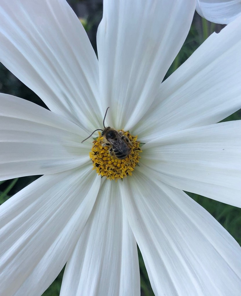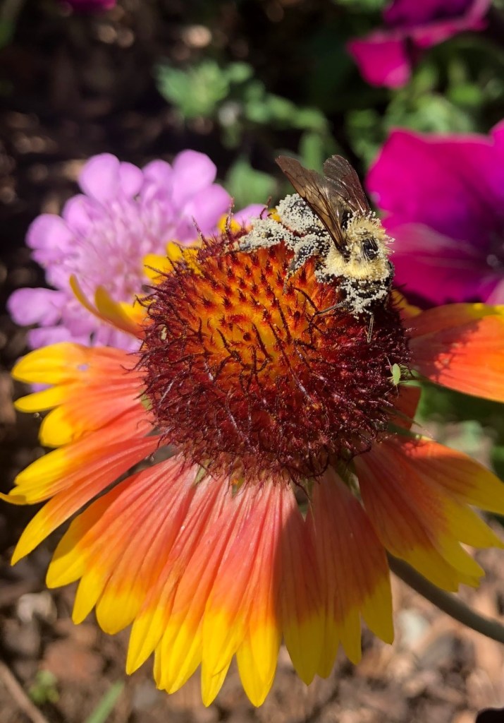 I don’t know what kind of bee this is… I can’t tell what’s under all that pollen! It looks like he rolled in it!