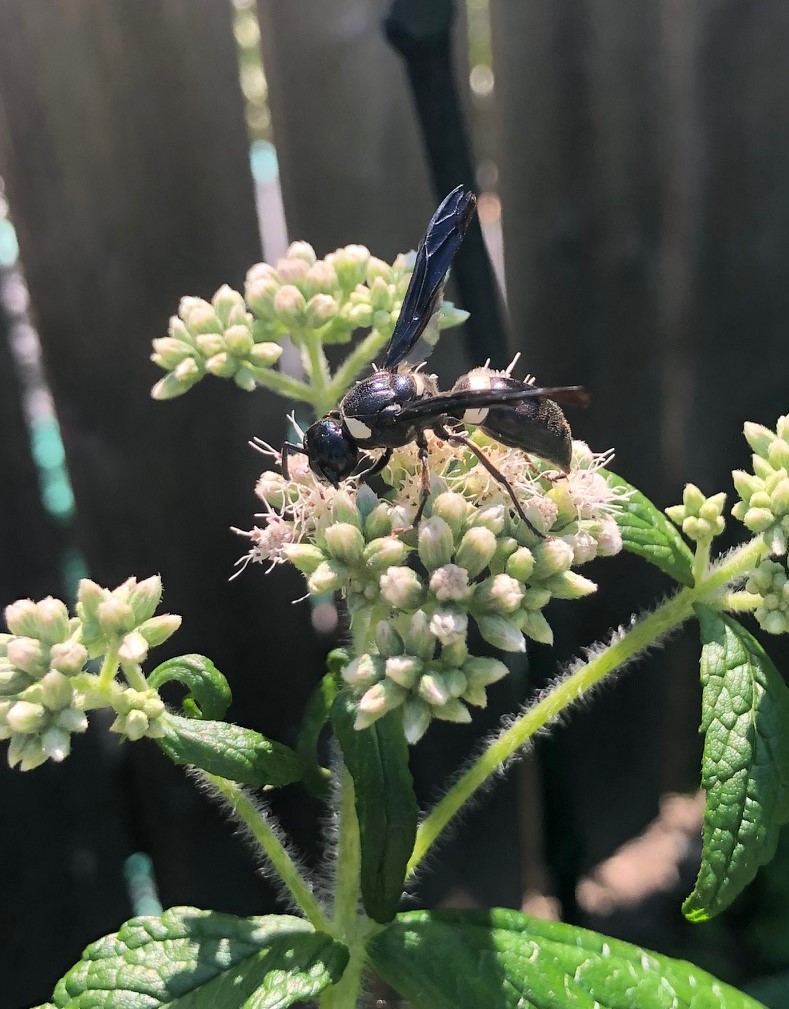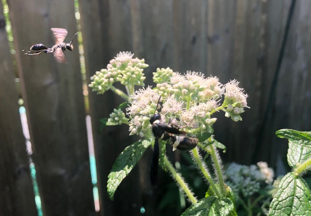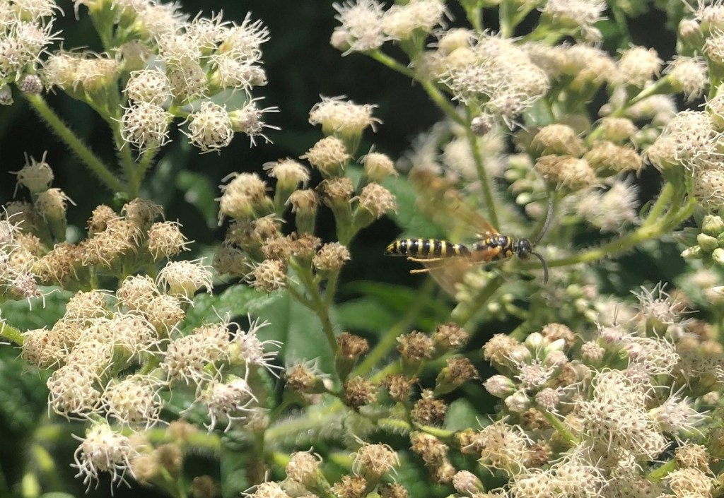 This plant is called Boneset. It’s one of the native plants I put in this spring. It’s not very showy, and it’s flowers are kind of odd looking. But it’s ALWAYS covered in bees, wasps, and hoverflies.