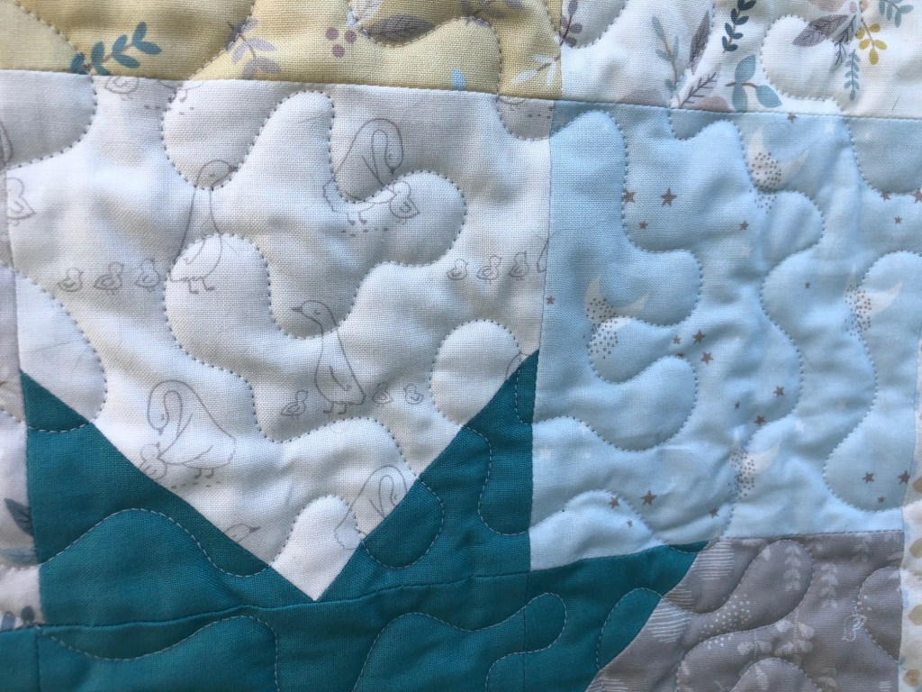 While I did all the quilting on the baby quilts at Mom’s, I brought them home to tack the binding down. I’ve said before, I love hand sewing the binding. I put on some good tv and just get to it. The first quilt whipped along nicely. Then I picked up the second one, and the skies got dark. The wind began to howl and a thunderstorm rolled through.
