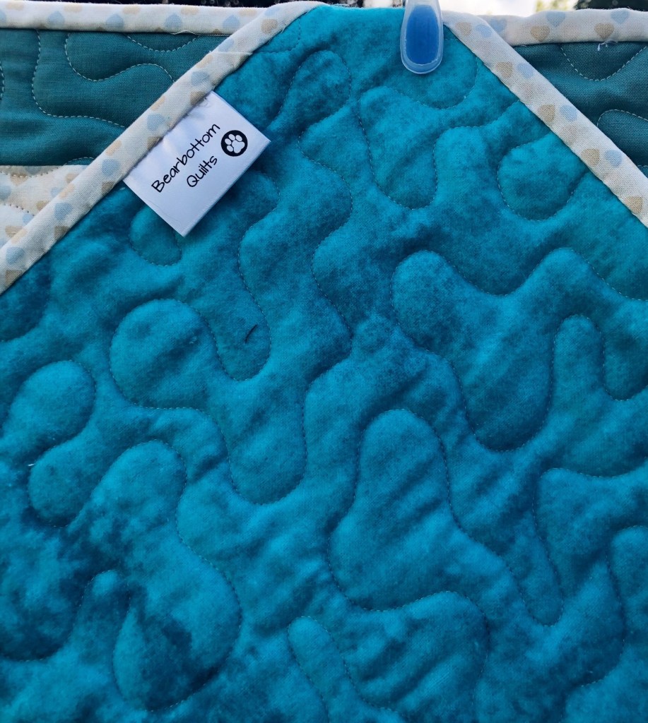 The back is a chunk of mottled teal flannel that is almost the exact shade as the solid on the front. It was leftover from a quilt Mom and Paisley made a few years ago.