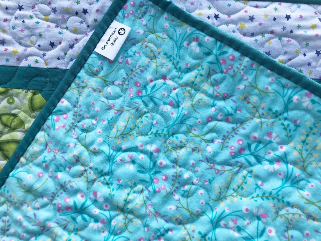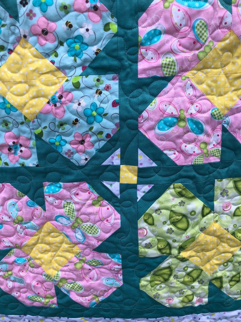 With the busy pattern, you can’t tell. And it was worth it, because it couldn’t be more perfect for this quilt. The recipient of this one is due next month. I’m just finishing up a little knit set (which you’ll see soon), and then I’ll get it in the mail to her Mom.
