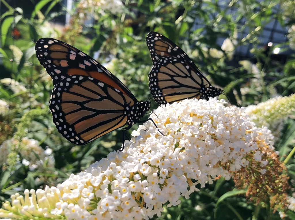 You can see it reaches over the catio fence, which is seven feet high. It’s grown through the catio fence, and is on both sides. It’s wonderful, but next year, I need to move some plants around to account for its size. But back to the monarchs….
