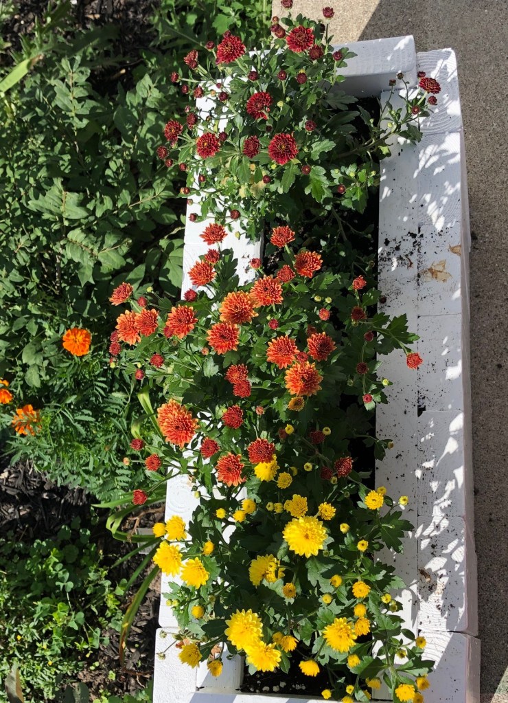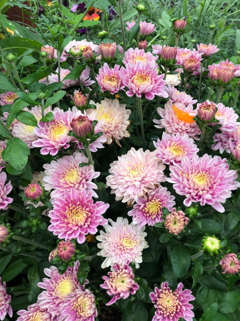 The weather is still quite warm and wonderful here, so things are still blooming nicely. And the front porch mums have bloomed.