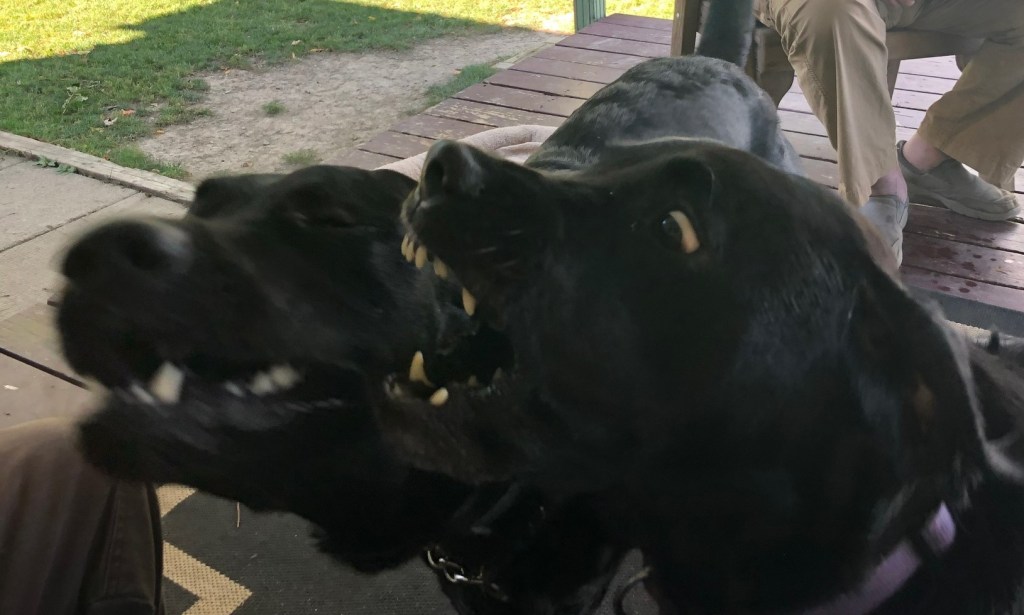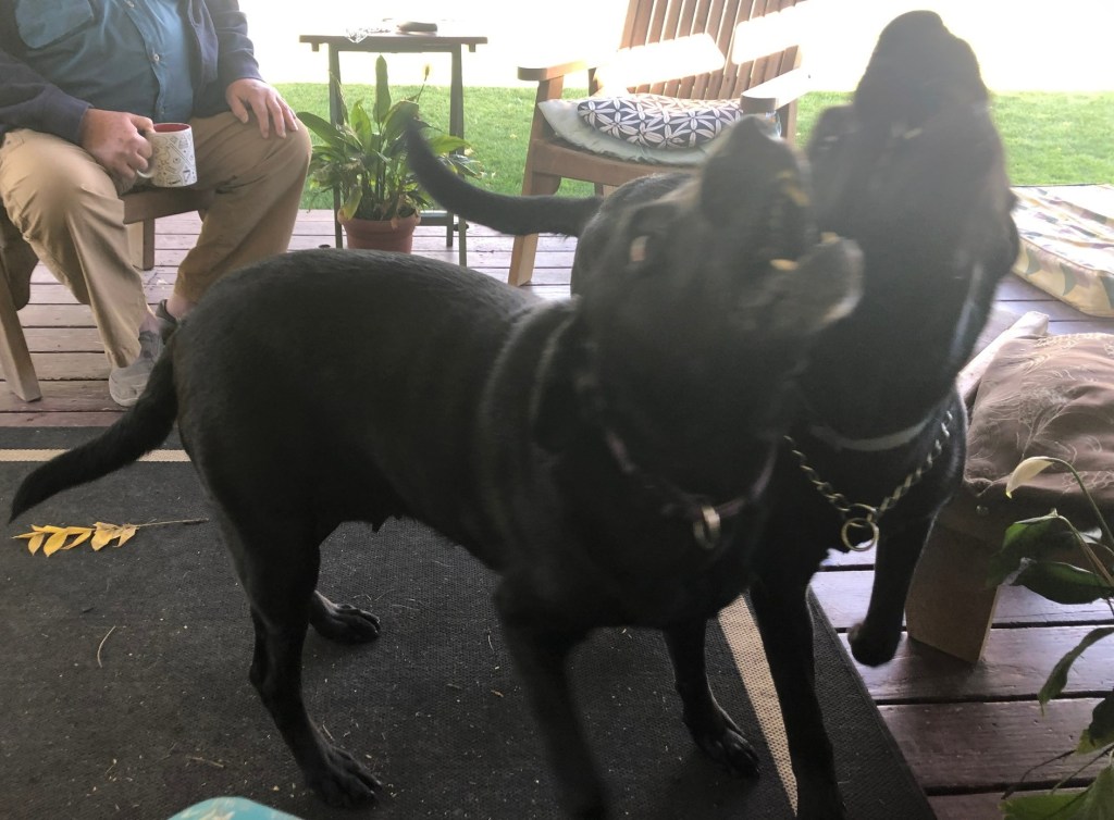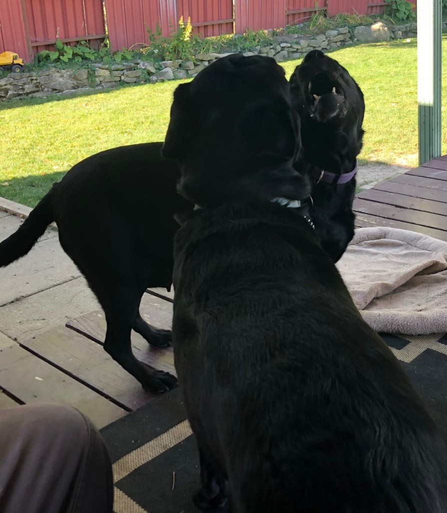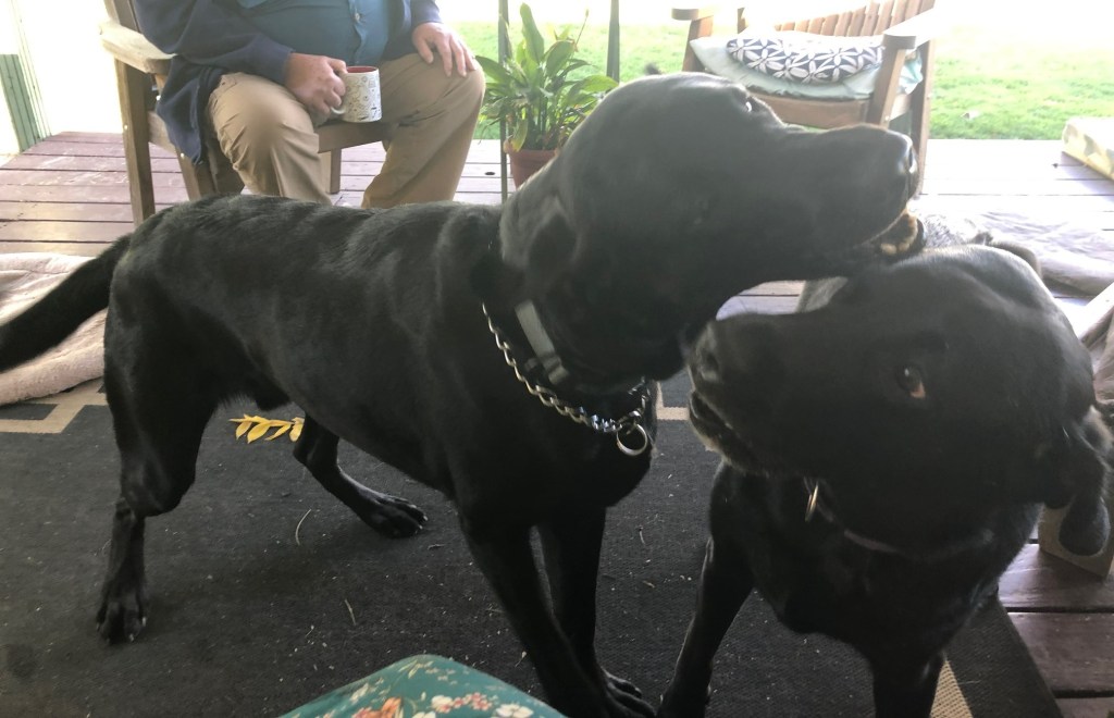 Of course, Jem was thrilled to have a visitor, and the pair of them were just full of beans. As you can see, it’s hard to tell them apart. Rebel (the one with the chain collar) is taller, and skinnier, but when they are playing they are both just big, black blurs.