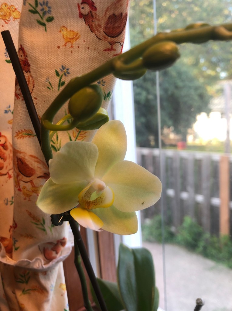 Grandma’s old tea cart, and another little wooden stand keep these beauties in the light. This window is north facing, so I put my orchid collection. The kitchen window is north facing, and my little yellow orchid has been living there very happily since we moved. In fact, it just started blooming again!