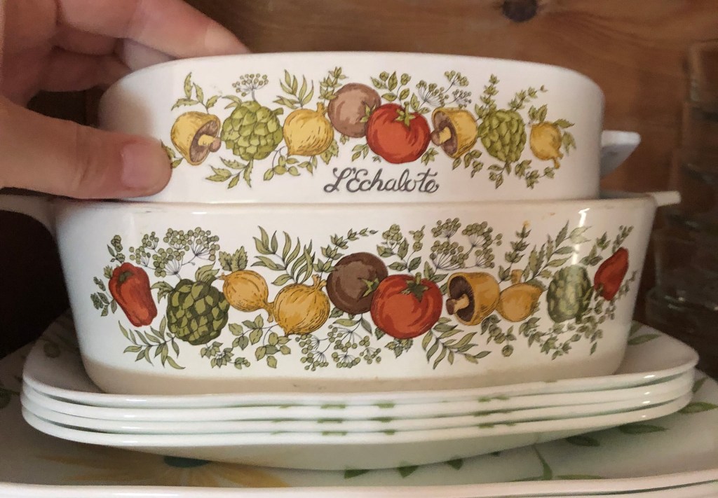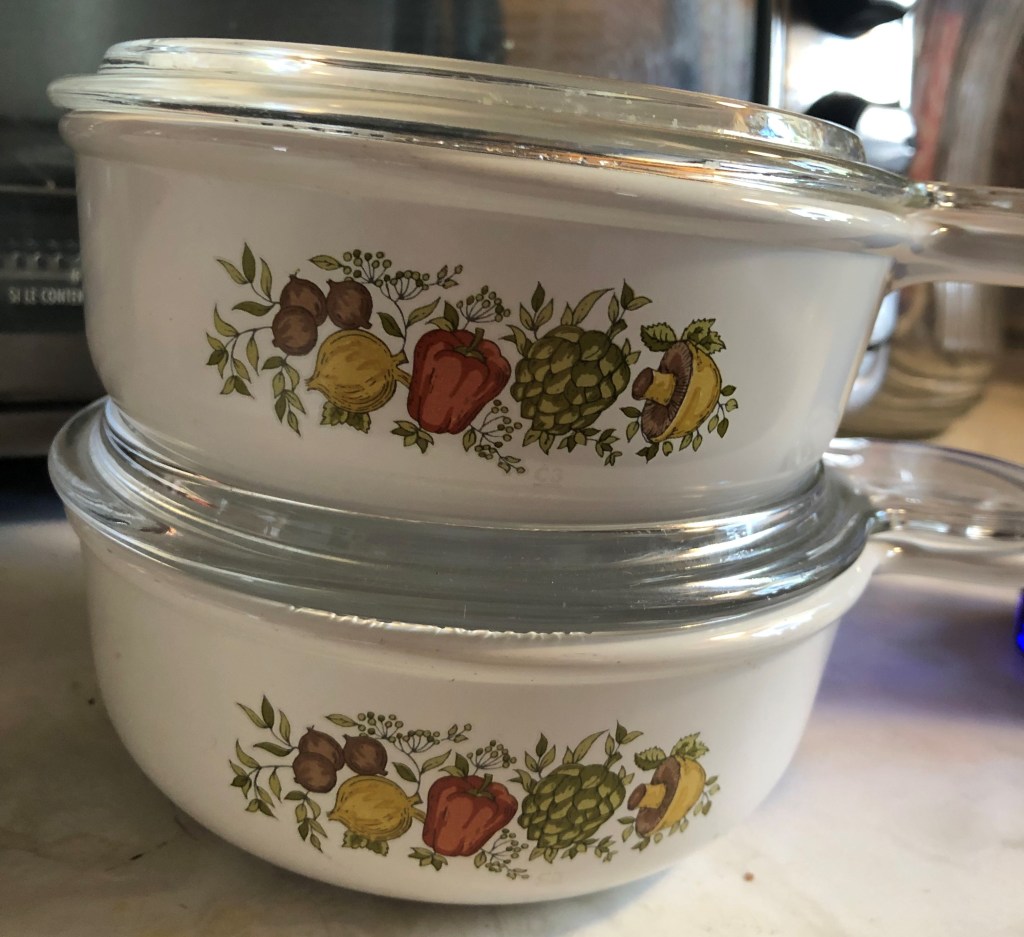 Not long after I moved out on my own years ago, Dave’s mom gave me a small “Spice of Life” Corningware casserole dish she had kicking around. It was missing a lid, but it was the perfect size for making small dishes for one or two. I loved it so much, I asked Mom to keep her eye out for more as her and Dad were antiquing. She found me another, medium sized one with the lid.