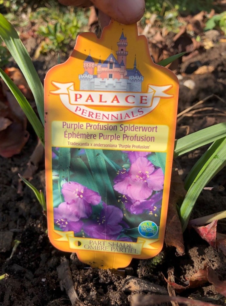 Spiderwort has foliage like a dayliliy, but smaller simpler flowers. I planted a bareroot one back in spring, with no luck, so I figured I’d try these two. I might have better chances with an already established plant.