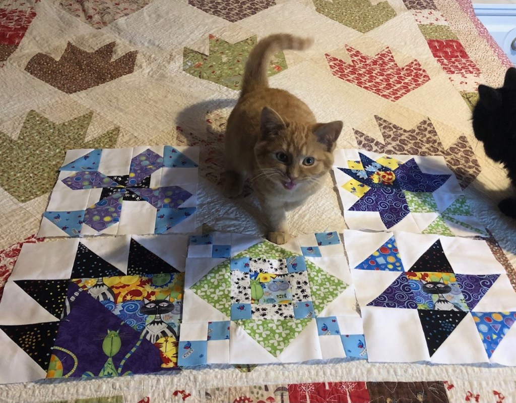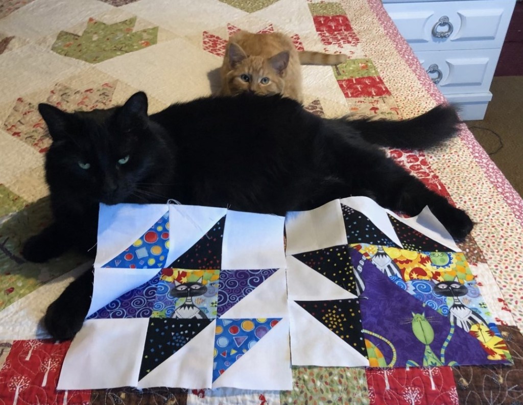It is wonderful that Burton has become Lemmy’s pal. They are both adorable! Beautiful blocks and I love that cat fabric.