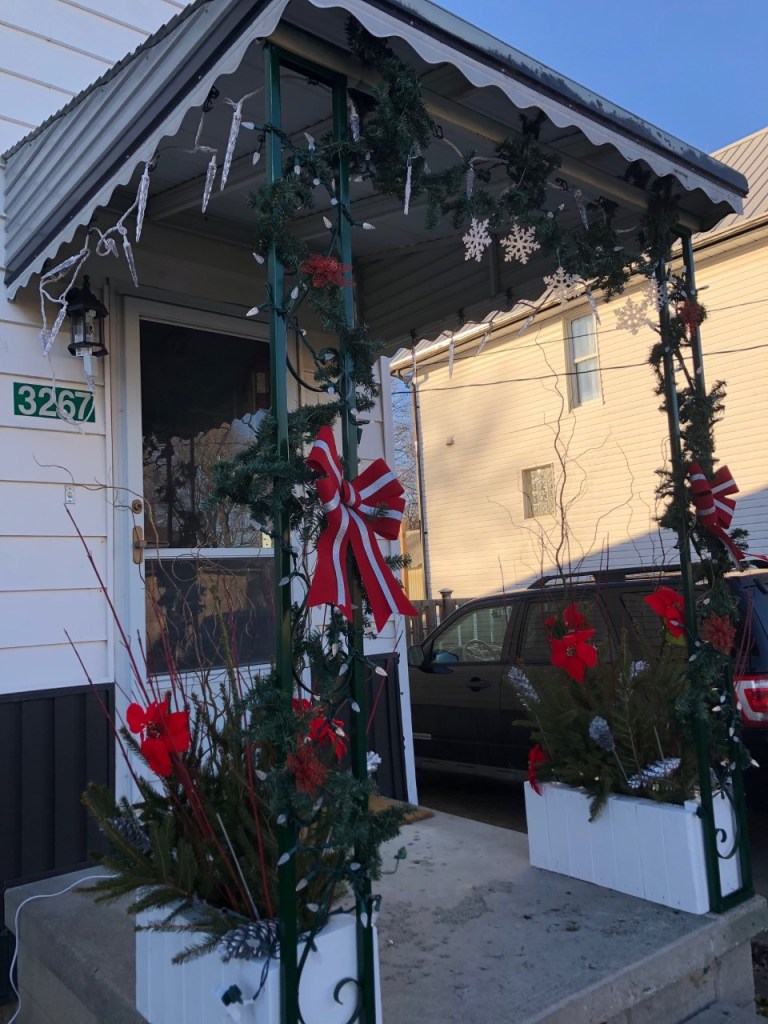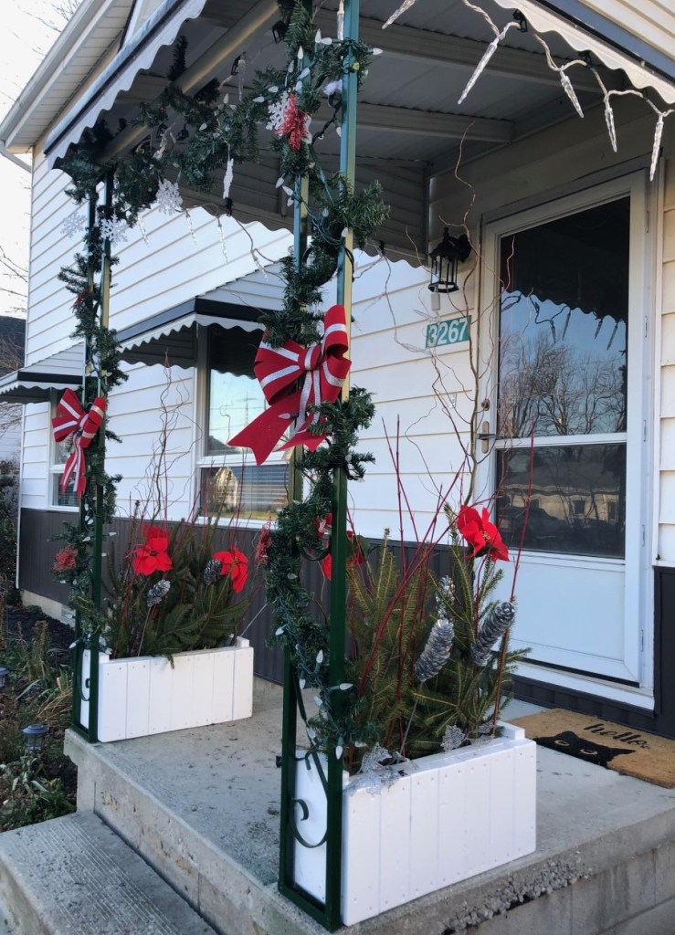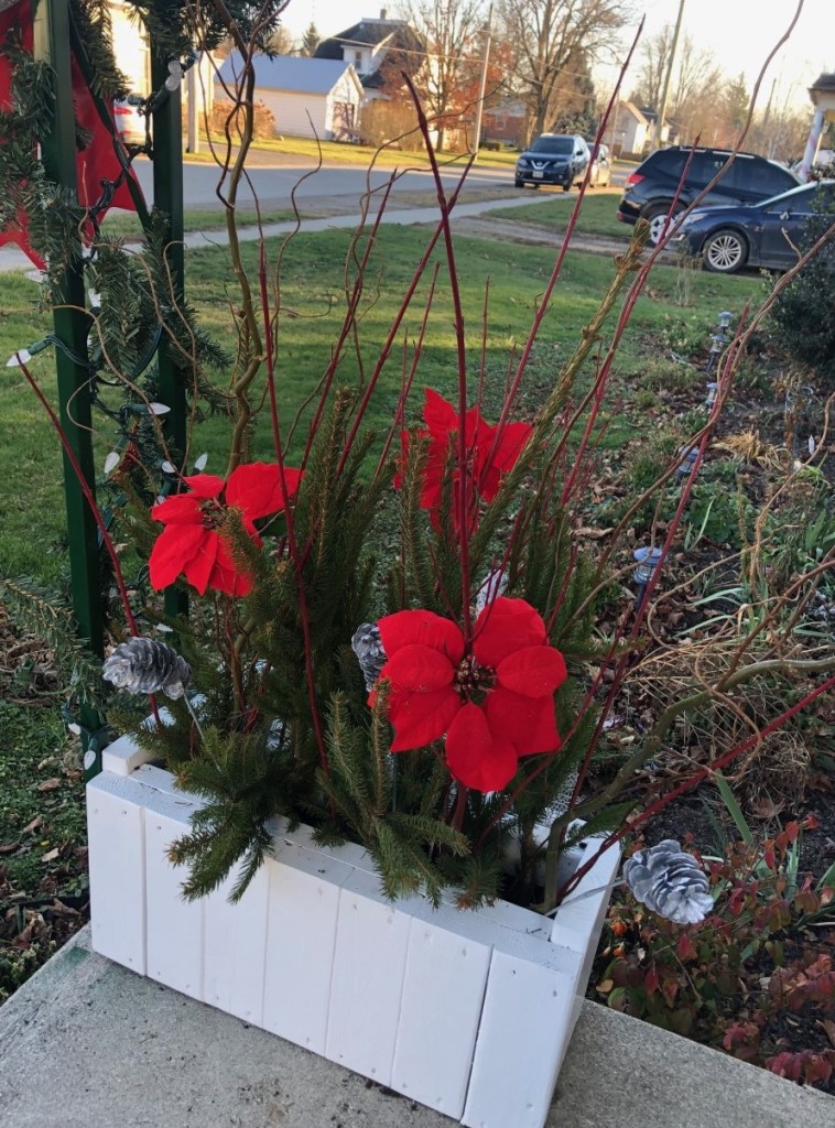 I took out the dying mums, and filled them with fresh greens and willow twigs, which was purchased from a local nursery. I had a few silk poinsettias from old decorations at the townhouse, so I added a few of them in for a nice pop of red. And as pretty as it is during the day…