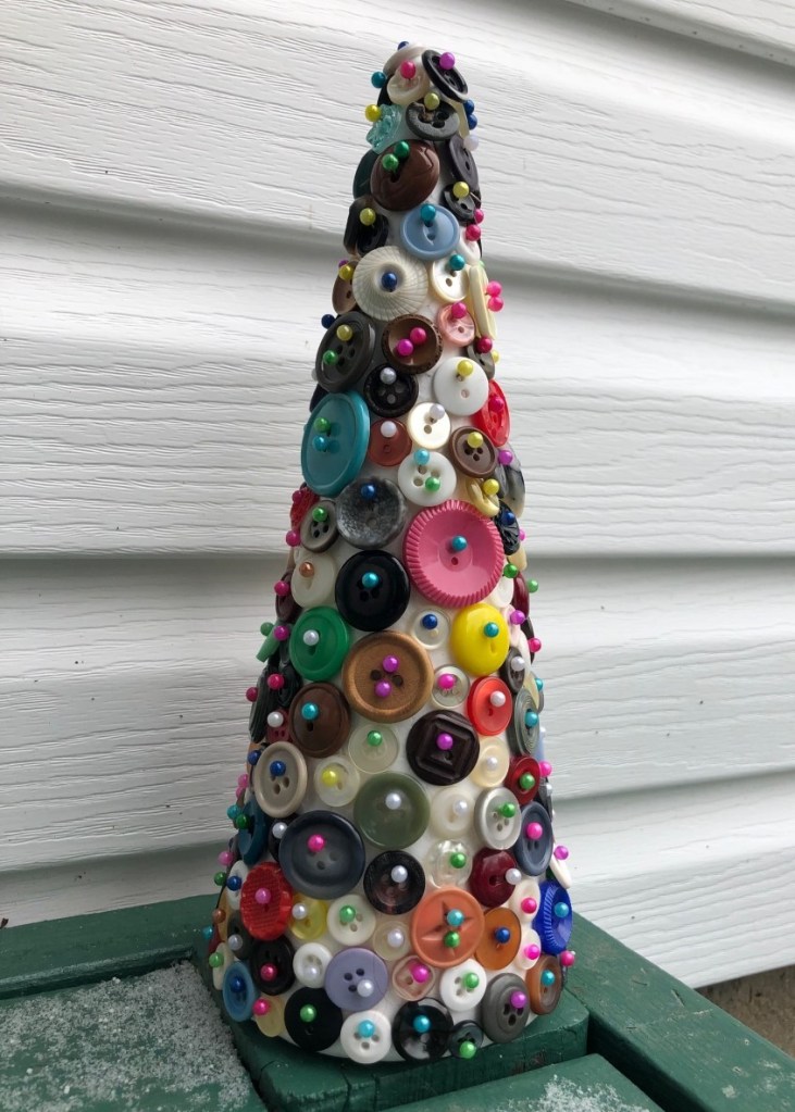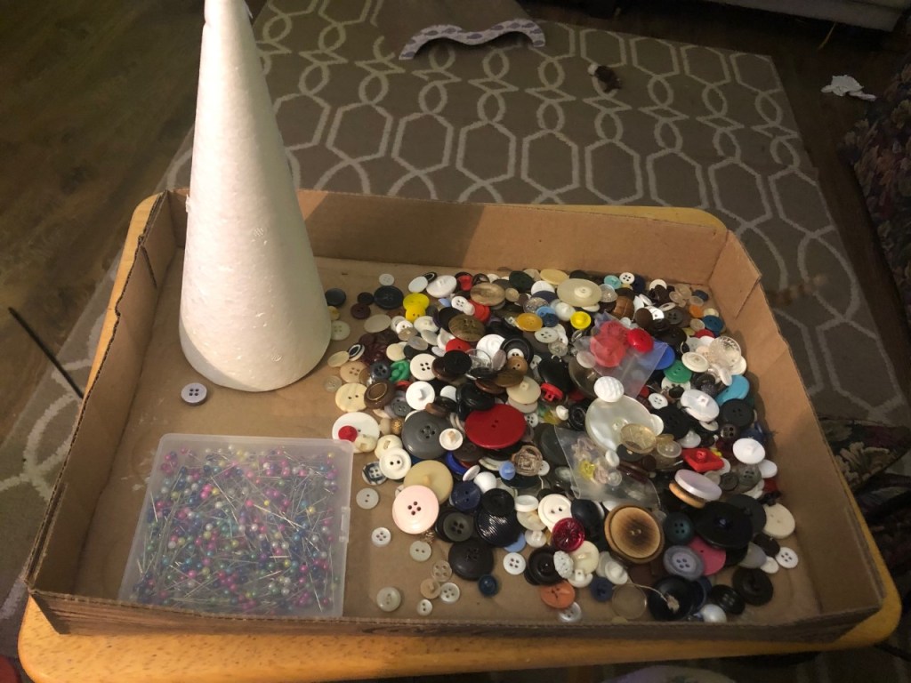 I have a large collection of spare buttons, inherited from an old relative. All I needed was some pins (which I got from Amazon) and a stryrofoam cone (purchased from a dollar store)