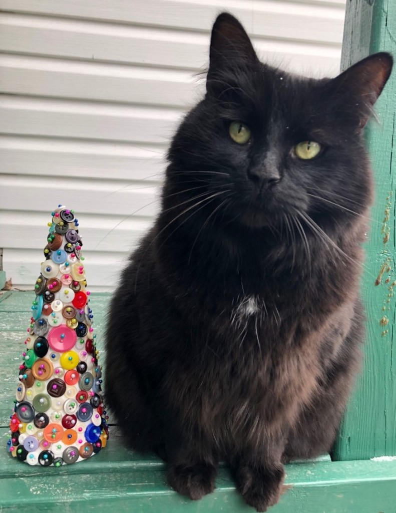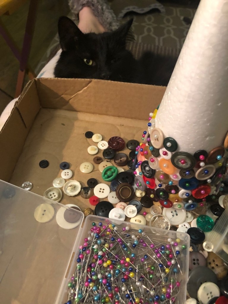 Burton always loves it when the buttons come out, and settled in to help. It wasn’t a super fast project, but by the time the evening was up, I had a completed button tree.