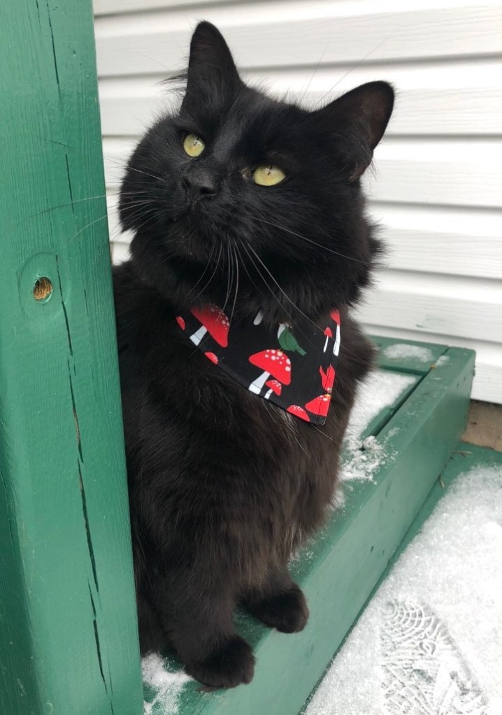 Of course, with all that floof, it’s not really apparent it’s a Christmas bandana at first glance. But he’s happy, and that’s what matters!