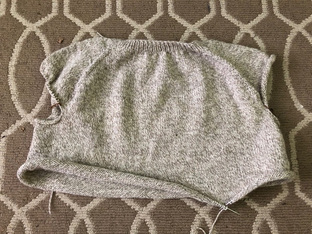 It’s maybe four inches further since you last saw it. Which means I still need to knit seven inches of plain knitting, and two or three of ribbing to finish the body. Then there’s still the sleeves.