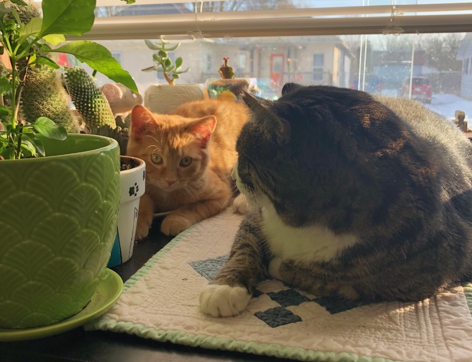 What sweet pictures. It’s nice to see the 3 amigos warming up to Lemmy!! Love the picture of Relic on the table with all the plants and Lemmy on the shelf underneath – too cute.