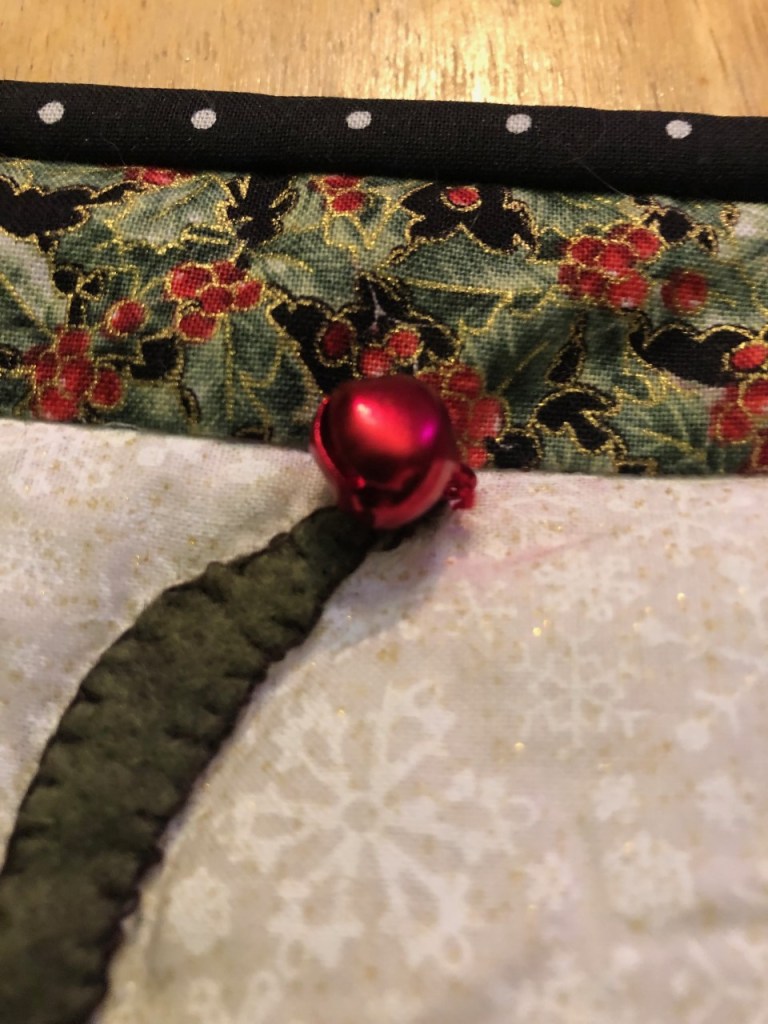 The kit actually came with plain black fabric for the binding, but when the time came, I couldn’t’ find where I put it. There was a small chunk of polkadots left from Little Wishes, and it was just enough for the binding… so I call it a happy accident. Those dots just up the whimsy of the piece even more in my opinion.