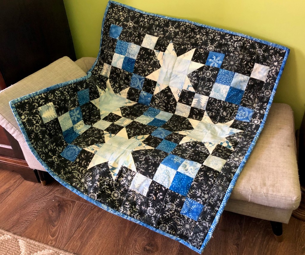 It’s all batiks, leftover from the two snowflake quilts (yet to be quilted). I forgot to take pictures of the back of it, but it’s just a chunk of mottled light blue flannel I picked up on clearance.
