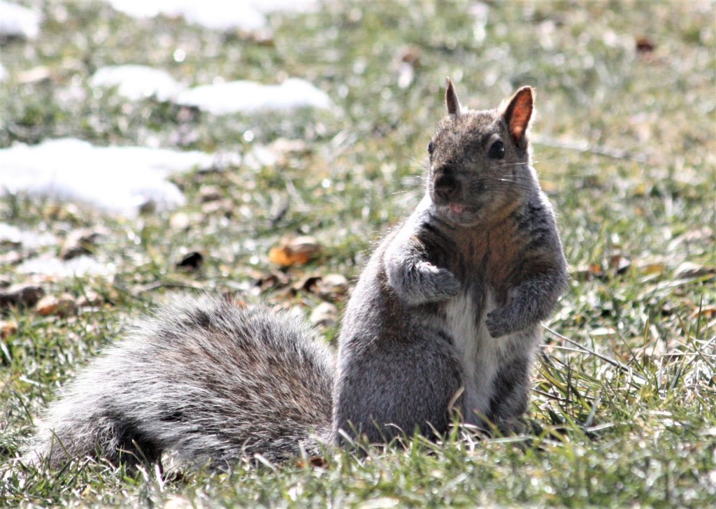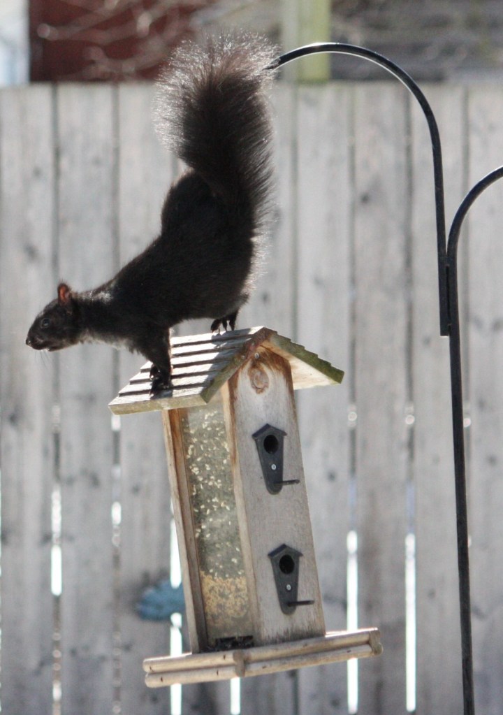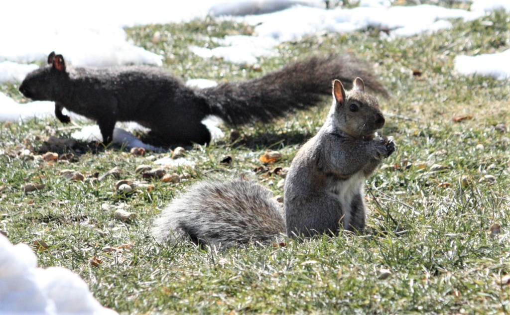 At the townhouse, we saw a lot of rivalry between the black and grey squirrels here. The gray ones (which always seem to be bigger) would run off the black ones every chance they got. But here, while they don’t seem to interact with each other, they tolerate each other’s prescence much better