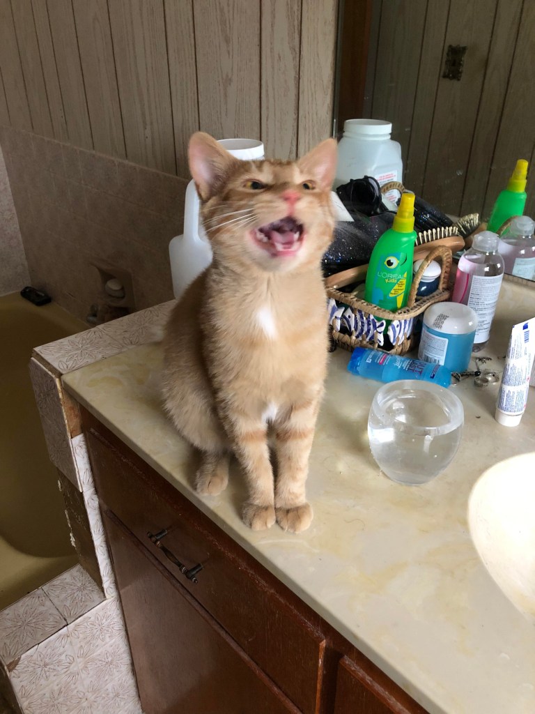 This isn’t the clearest picture, but I love it because it pretty much sums up most mornings. From almost the moment I get up, Lemmy is following me around, yelling. Not meowing politely…. yelling! Non-stop.
