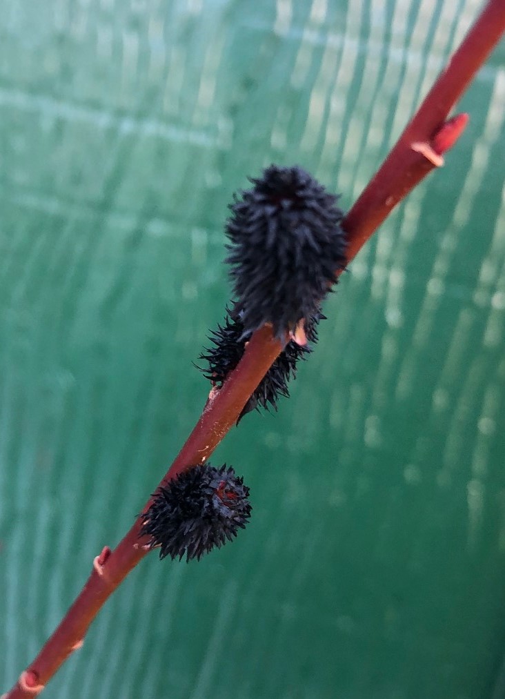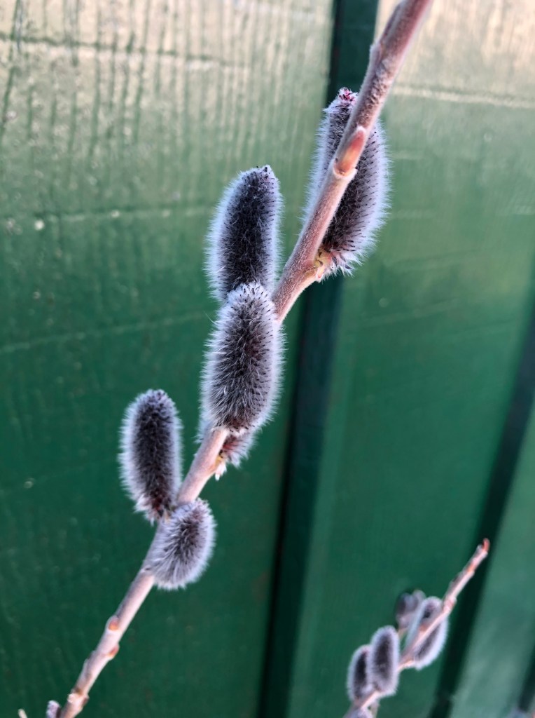 Elsewhere, the pink pussywillows have turned dark grey (as they do – it’s not a surprise). The black pussywillow is just starting to emerge. It doesn’t get as much sun as the pink does. And the regular pussywillow gets even less, so it’s just starting to bud up.