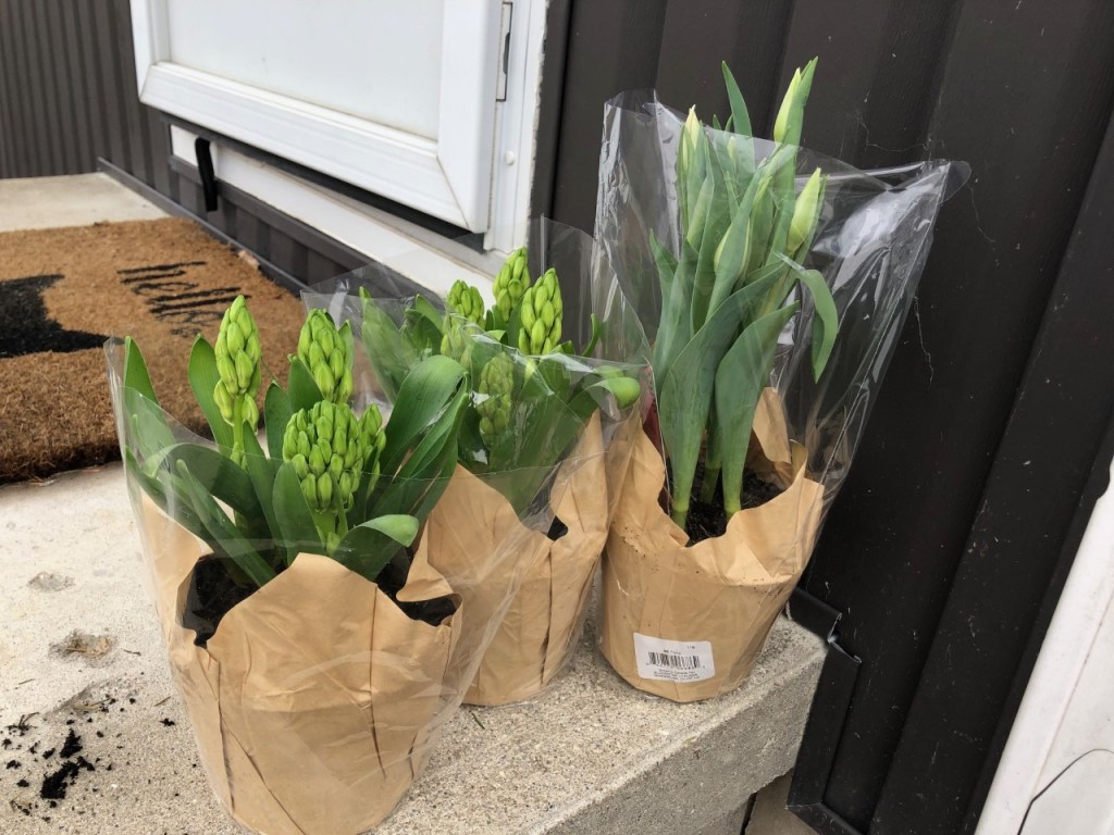 Hyacinths and tulips. And I picked out the ones that hadn’t bloomed yet. For $20, I was able to get enough to fill the boxes