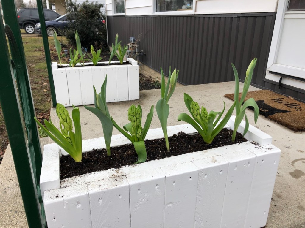 They probably still won’t bloom fully for another week or two – but at least there’s some green in the boxes. And the bulbs that were already sprouting in there will come up in between and provide some colour after these ones start to fade!