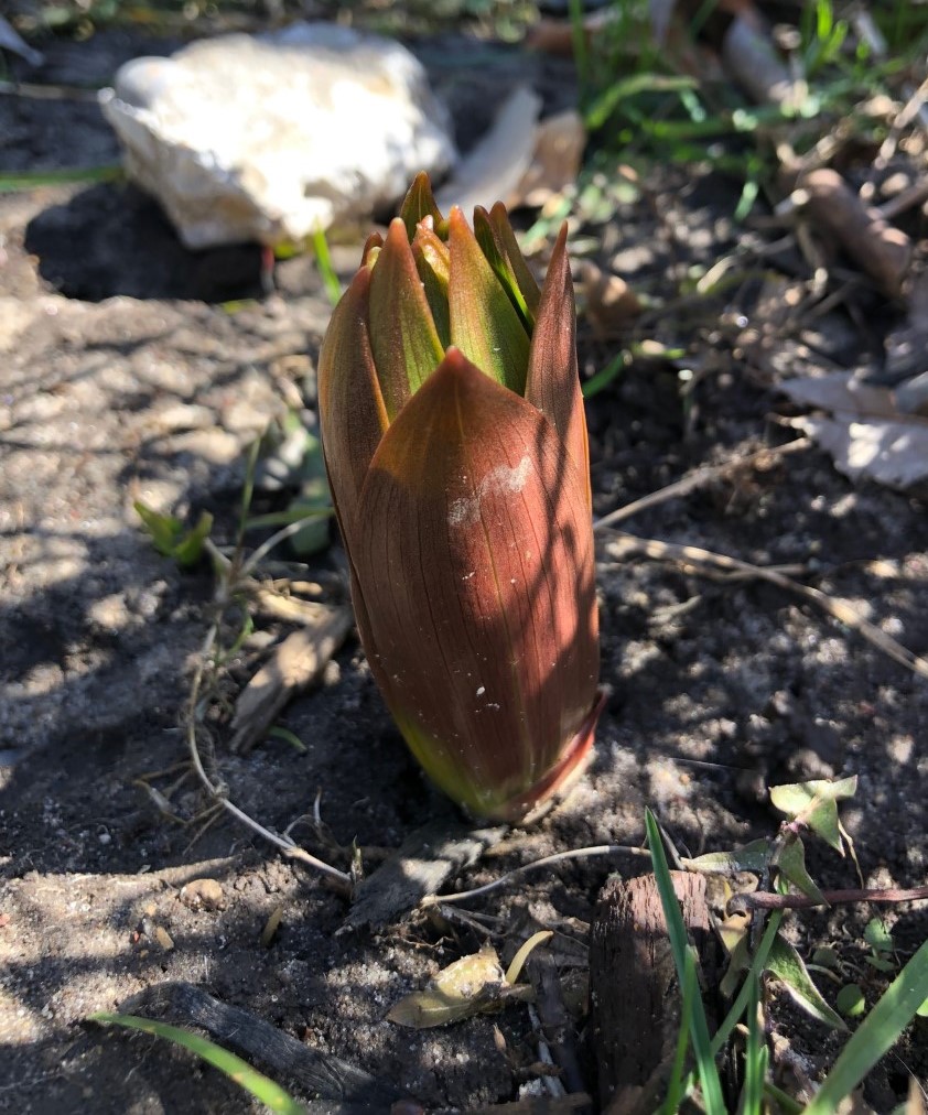 Elsewhere, there are signs of life everywhere. Left are my lupins – I love their starry little leaves – especially when they are just getting started. And right is one of the many lilies I planted in the fall. And I have more to plant this spring! It’s going to be lily-mania here!