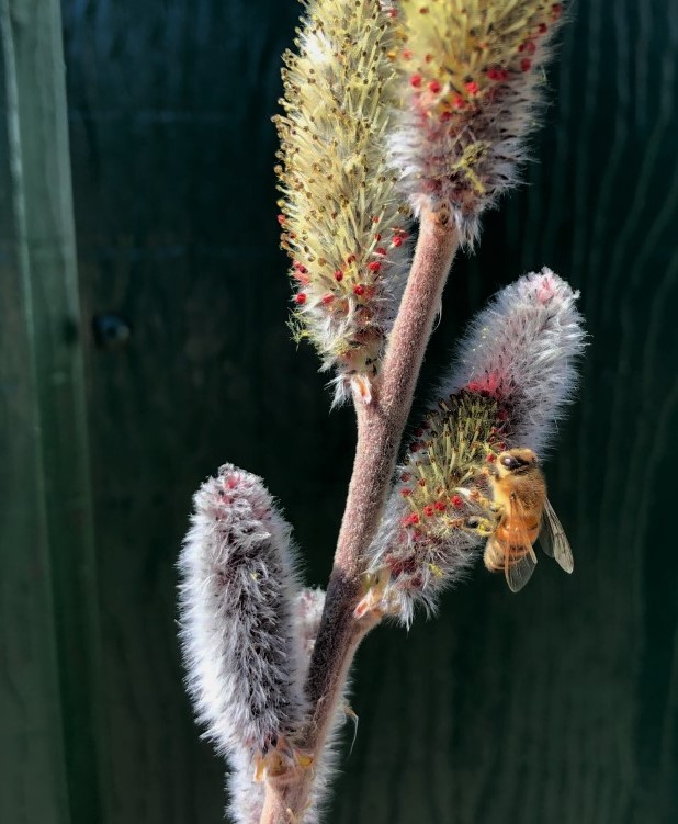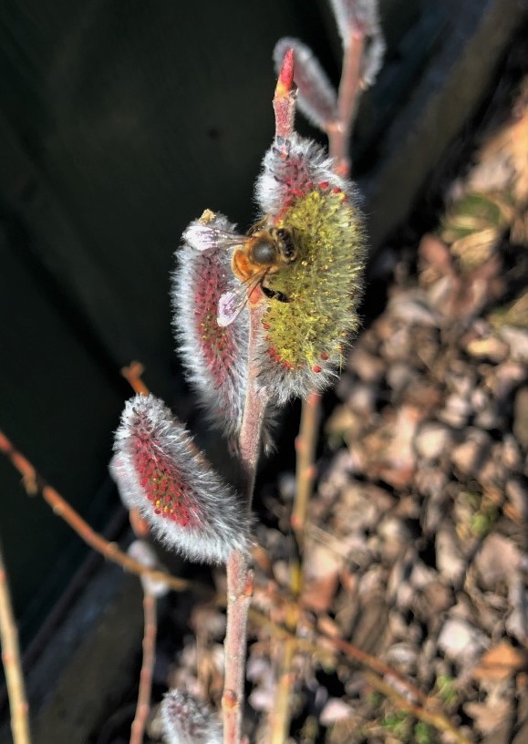 As is the pink (now grey) pussywillow which is starting to turn to pollen. My three different pussy willows by the shed bloom in succession, which is good for the bees – giving them several weeks of food at the start of spring.