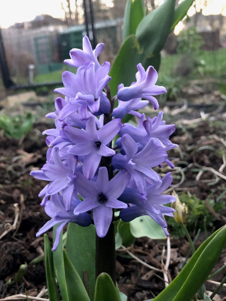 In addition to the white hyacinths in the porch boxes, I have others coming up in all the gardens. Most are in the catio. So far, I’ve got this lovely periwinkle blue, a pretty pale pink, and a much bolder pink. The bold pink one has had a bit of a rough time thanks to Lemmy and his constant zoomies. Though the flowers may be broken this year, the bulbs are strong, and hopefully, our ginger mister will be a little calmer next spring.