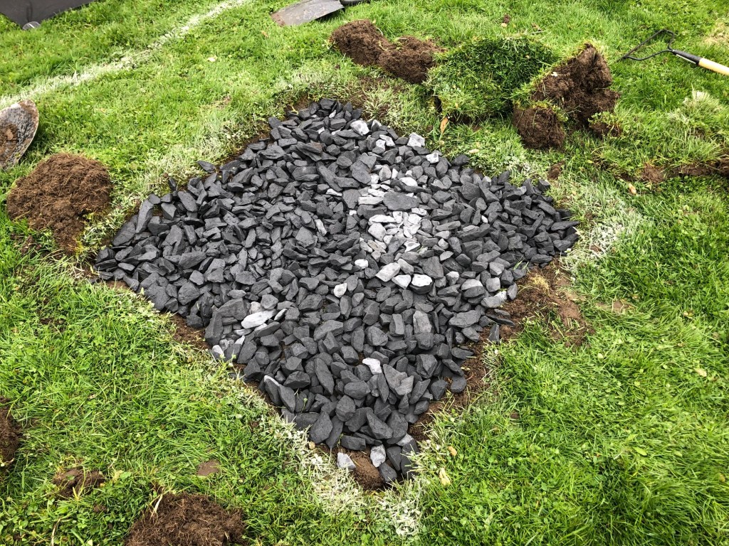 After the sod was off, and the ground was level(ish), I dumped in a few bags of lovely black slate.