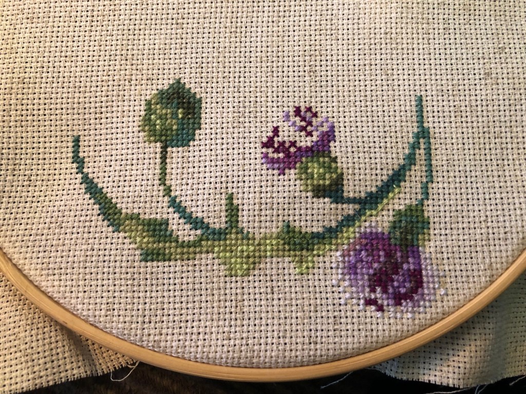 But I did managed to complete the green bits, and get a start on the second thistle flower. I’m actually probably about half done – this just isn’t a big piece. But it’s definitely going to be a pretty one.