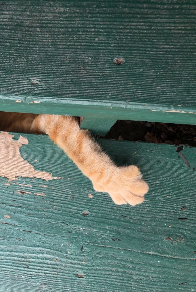 Lemmy has taken a liking to napping under the stairs that lead into the catio yard.
