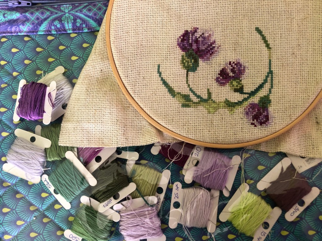 It took a lot of different colours to make those three small thistles. I didn’t use the colours the pattern called for – just pulled what I had from my stash and hoped for the best. I think it worked out pretty good. And it’s going to look even better once I get all the back-stitching done on it.