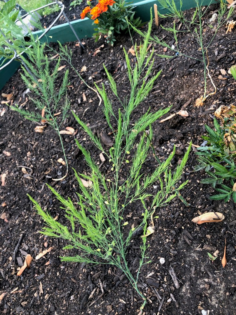 My wee asparagus sprouts have turn into asparagus ferns. And I think they are just the prettiest things. I’ve learned that you leave these ferns until they die off in the fall, so they will be a nice decorative touch in the garden all summer