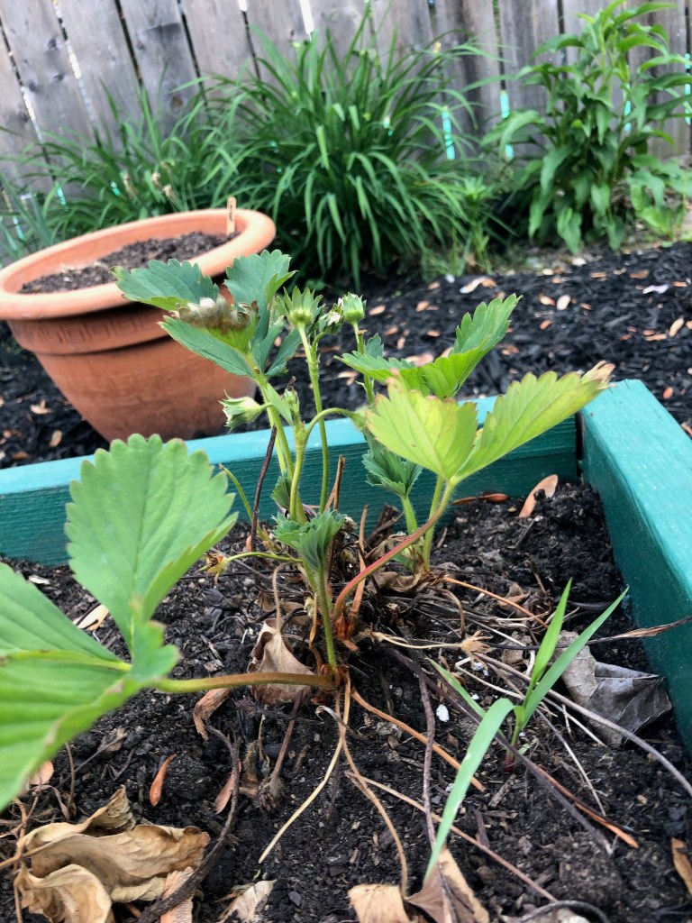 Neither the chives or the catnip in the pots are showing signs of life. And the strawberries are struggling. None of the new (bare root) plants I put in are growing yet. And the older plants are on the thin side.