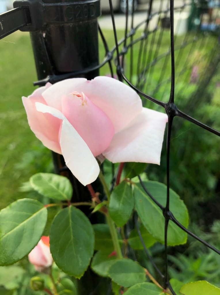 It’s a climbing rose I bought last year to climb up the catio fencing. It didn’t get one flower last year, but this year it’s covered in buds and several are opening up into these beautiful pale pink blooms! And it’s only halfway up the fence – it’s only going to get better each year.