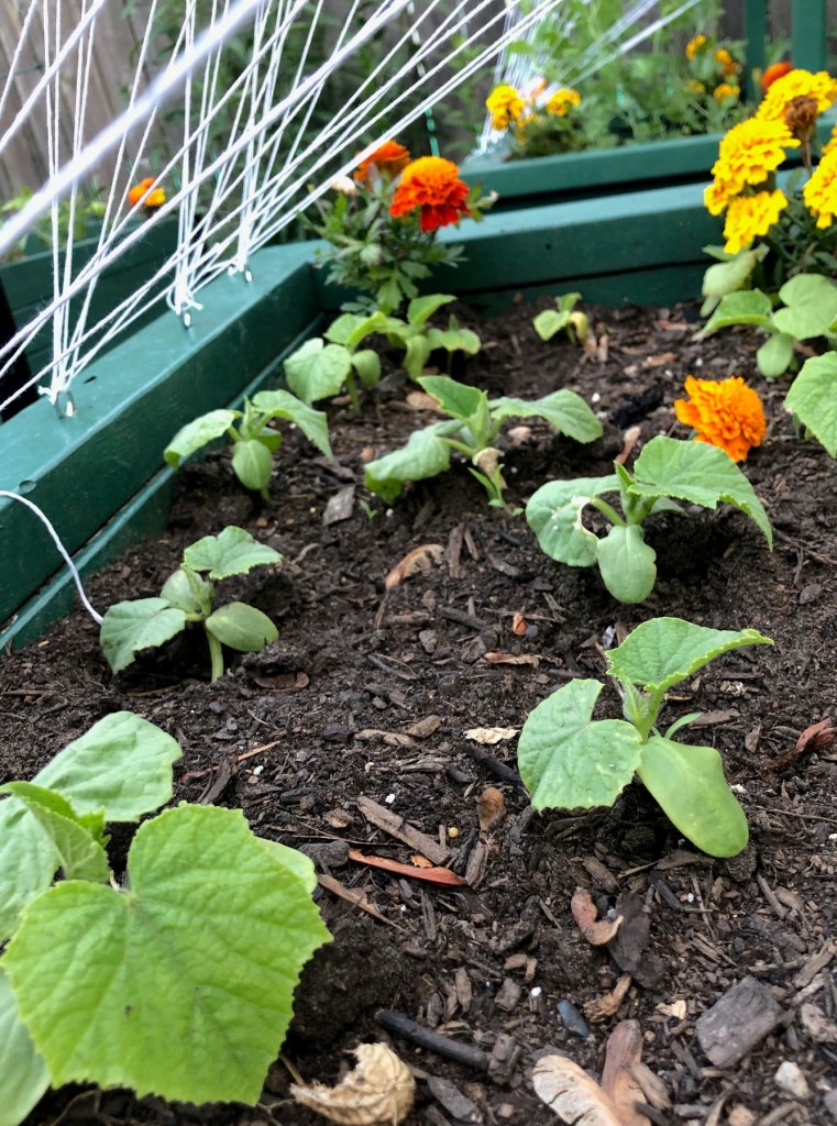 The cucumbers don’t need the same support quite yet, as they are still very small.