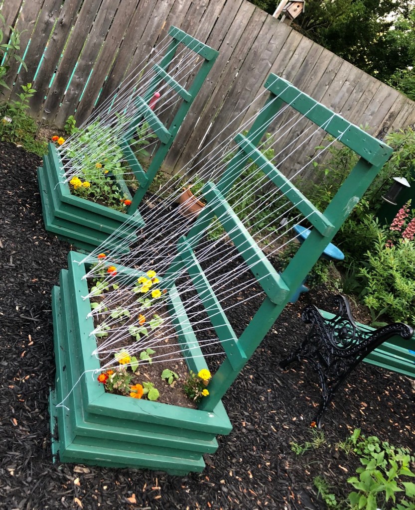 Your vine supports are so pretty! Over at Dad’s, I tied an old wire mattress support from an old twin bed up to the fence and let the peas grow on it. I still laugh about it when I think of it but it worked. Best snap peas ever.