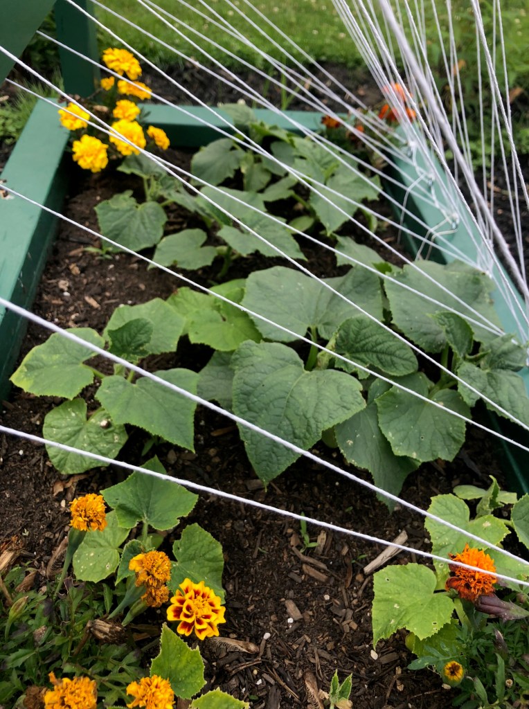 The cucumbers aren’t climbing the rigging just left, but they are busting out all over the place. The leaves have gotten huge!