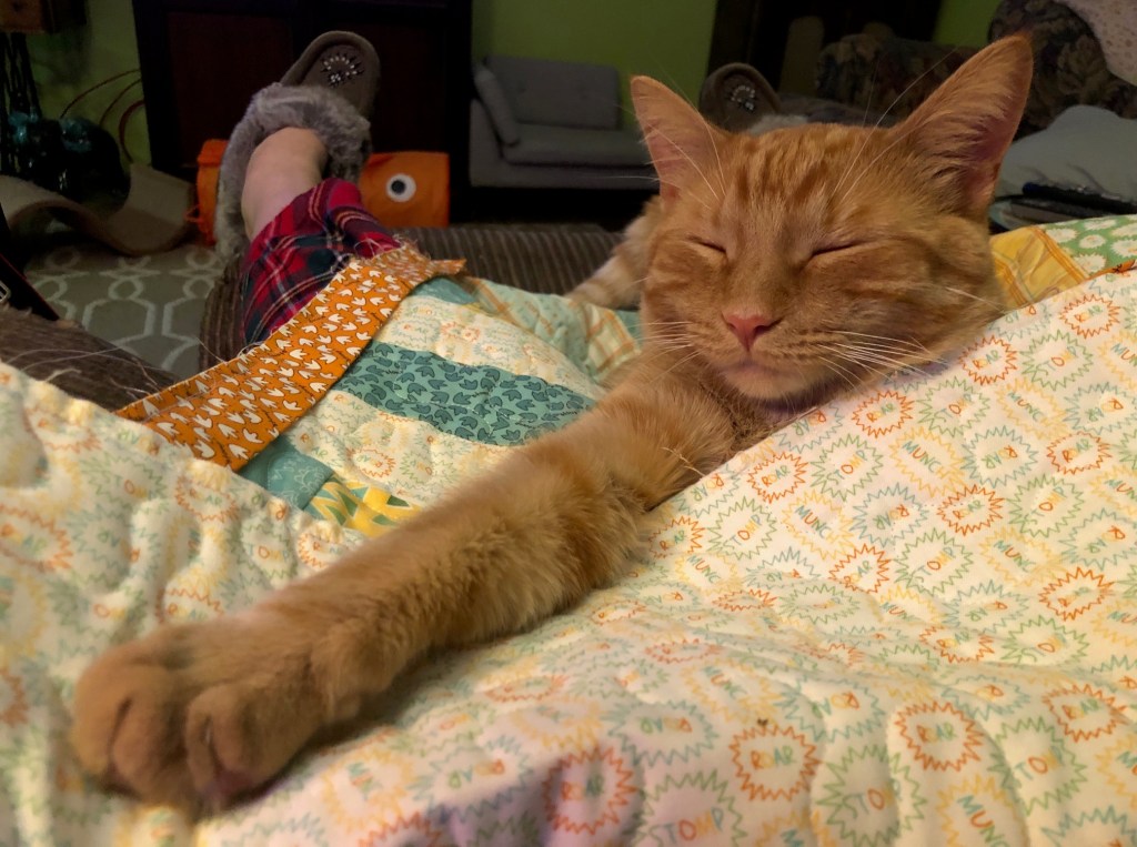 Oh Mom! He asked so nicely too, even putting his hand, err paw, out to beg for it. Such a sweet little quilt, perfect for a little one.