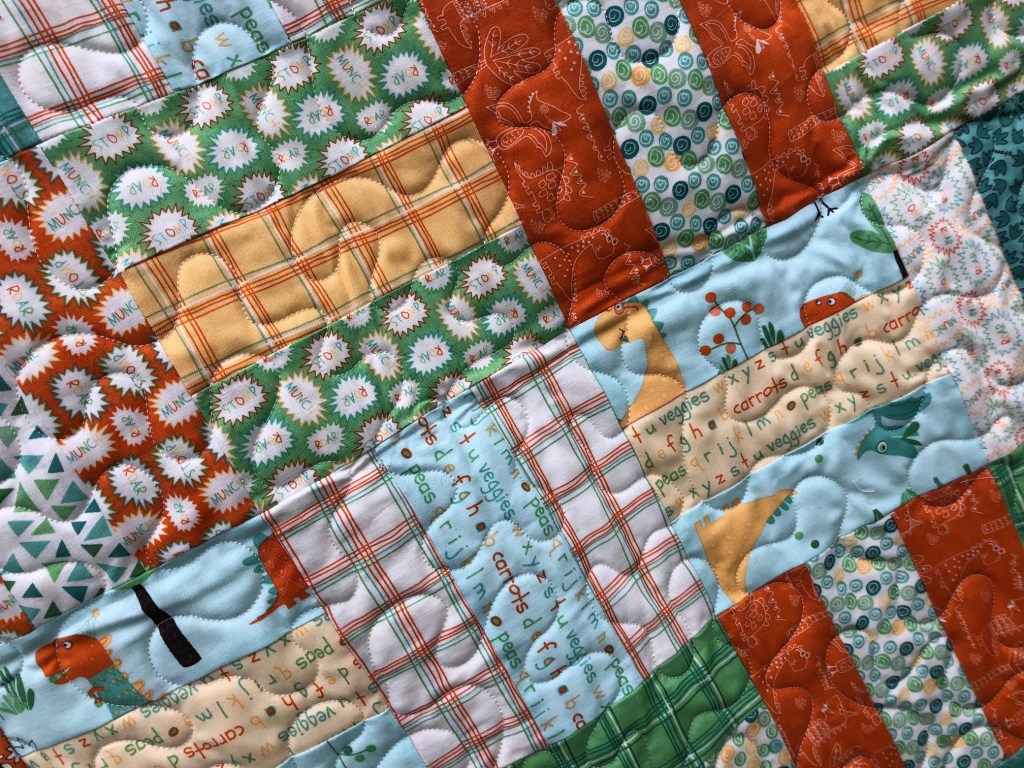 This, of course, is the baby quilt made with the adorable “Eat Your Veggies” fabric line. Using a jelly roll meant this one went together super quick.