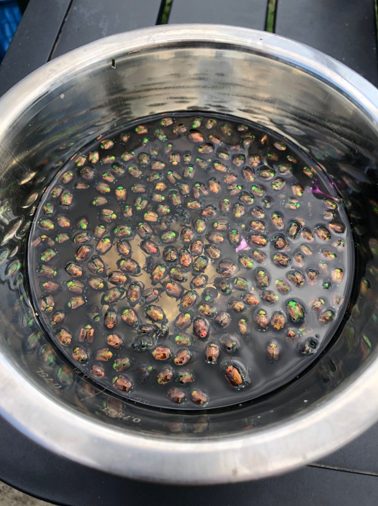 I mentioned several posts back about my battle with the dreaded Japanese beetles. Every day, I go around the garden to do battle with the pests. I got out usually at least three times – once in the morning, once in the afternoon, and once in the evening, and I pick the beetles off my plants, and put them in this bowl of water, mixed with a little dish soap. I pick off about this many beetles almost every single day.