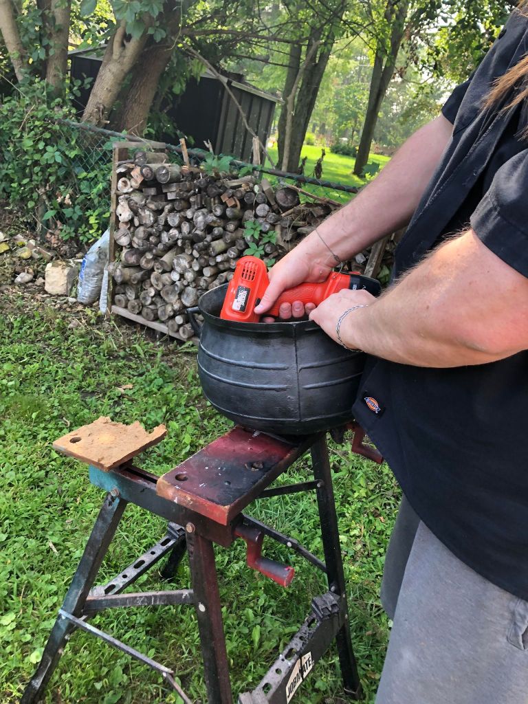 Yes. It’s a cauldron. And it’s cast iron! It’s not super huge… maybe 20″ across. It wasn’t in great shape – the inside was quite rusted.