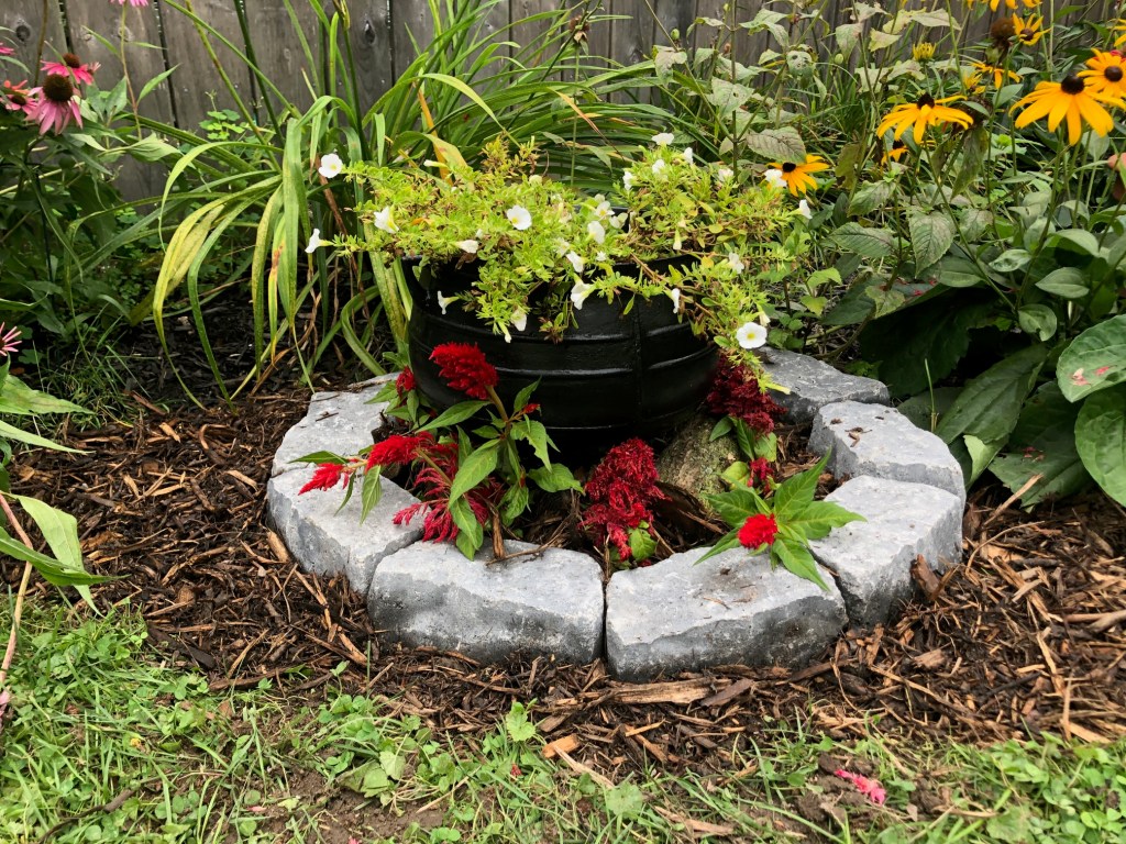 On our last trip to Rona, I got some fire pit bricks. Then I cleared a little corner just outside Edible Alley. I pulled up the celosia I had planted in the catio, and the calibrochoa from the white boxes out front and…
