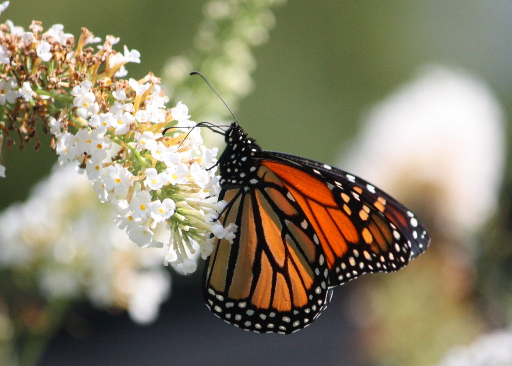 I’d walked for a about an hour and was on my way back to the office when I came across this large, flowering shrub on someone’s front lawn. And it was absolutely covered in monarchs! There had to be at least 30. I was amazed. I snapped dozens of pictures (sadly, I don’t have any of them any more).